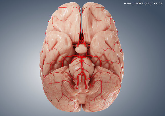 Information illustration – Title – Brain from below – dark – Keywords – Illustration, free, brain, arteries, dark background, bottom, brain stem, cerebellum, vessels – Copyright Notice – Creative commons – Attribution-NoDerivatives 4.0 International (CC BY-ND 4.0)