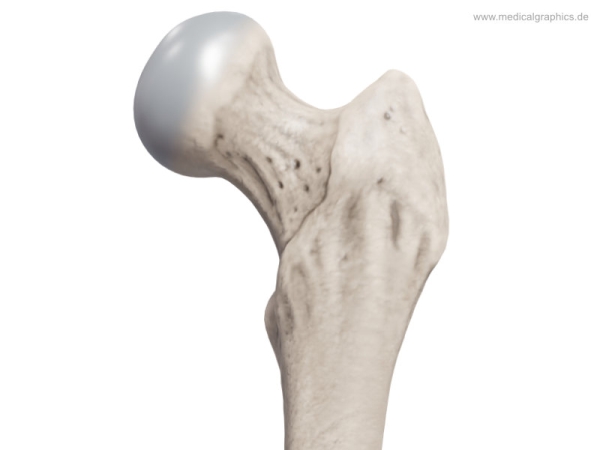 Information illustration – Title – Femoral head – front – Keywords – Femoral head, fovea capitis femoris, femoral neck, greater trochanter, thigh shaft, minor trochanter – Copyright Notice – Creative commons – Attribution-NoDerivatives 4.0 International (CC BY-ND 4.0)