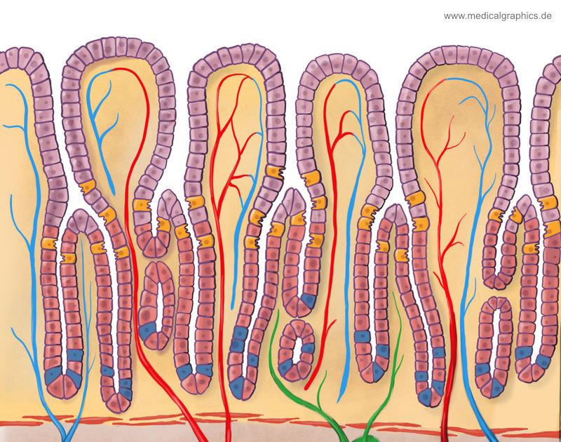 Information illustration – Title – Sectional view of gastric glands with blood vessels – Keywords – Foveola gastrica, surface epithelium, accessory cell, accessory cell, main cell, gastric gland, submucosa, serosa, blood vessels, – Creator – www.medicalgraphics.de – Copyright Notice – Creative commons – Attribution-NoDerivatives 4.0 International (CC BY-ND 4.0)