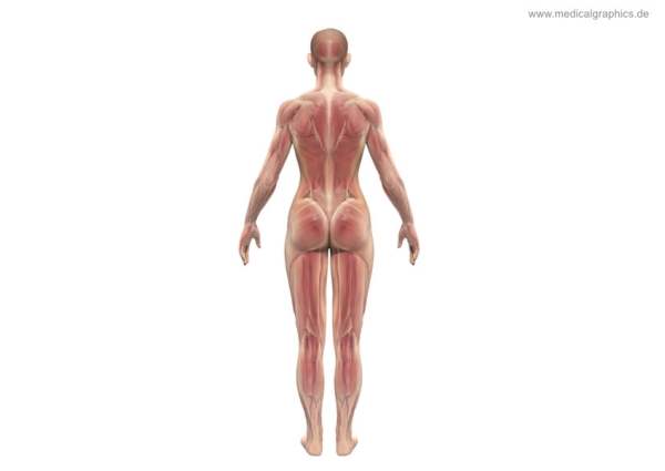 Information illustration – Title – Muscles woman – back – white background – Keywords – Muscular system, woman, complete figure, posterior, anterior, white background, trapezius muscle, deltoid muscle, dorsi latissimus, triceps brachii muscle, gluteus maximus muscle, external abdominal oblique muscle, gluteus maximus muscle, M. Biceps femoris, M. semitendinosus, M. semimembranosus, M. soleus, M. gastrocnemius, M. plantaris – Creator – www.medicalgraphics.de – Copyright Notice – Creative commons – Attribution-NoDerivatives 4.0 International (CC BY-ND 4.0)