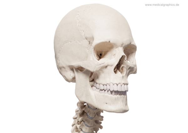 Information illustration – Title – Skull with cervical spine – side – Keywords – free, illustration, skull, cranium, cervical spine, side, C1, atlas, C2, axis, C3, C4, C5, C6, C7, cervical vertebrae, articular processes, spinous processes – Copyright Notice – Creative commons – Attribution-NoDerivatives 4.0 International (CC BY-ND 4.0)