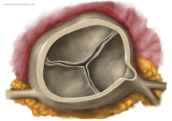 Stichwörter Aortenklappe, Valva aortae, Kranial, Valvula semilunaris dextra, Valvula semilunaris sinistra, Valvula semilunaris septalis, Aortae, Arteria coronaria dextra, Arteria coronaria sinestra, Koronararterien, Aortenwurzel, Bulbus aortae