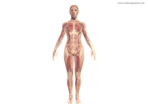 Titel Muskelsystem Frau- frontal – weisser Hintergrund