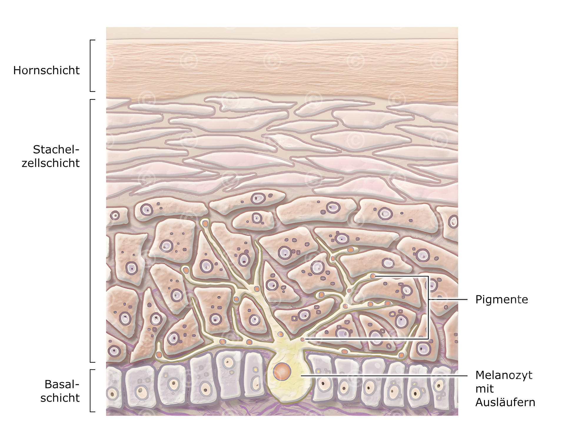 Die Illustration zeigt eine Schnittansicht der Haut. Eine Melanozyten (Pigmentzelle) ist in der Basalschicht (Stratum basale) der Haut zu erkennen, dessen Ausläufer in die Stachelzellschicht (Stratum spinosum) ragen und Melanin Pigmente aufweisen.