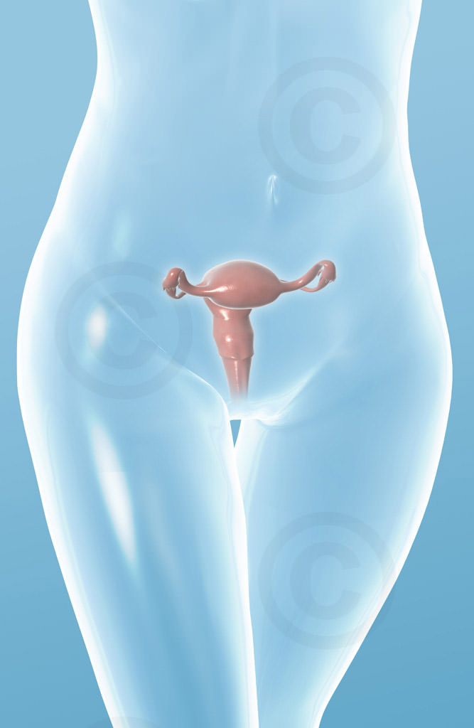 Gestaltung eines Key Visual für den Bereich der Gynäkologie. Die Illustration zeigt die gläsernen Silhouette einer Frau in welcher eine Gebärmutter, Eierstöcke, Eileiter und Vagina zu erkennen sind.