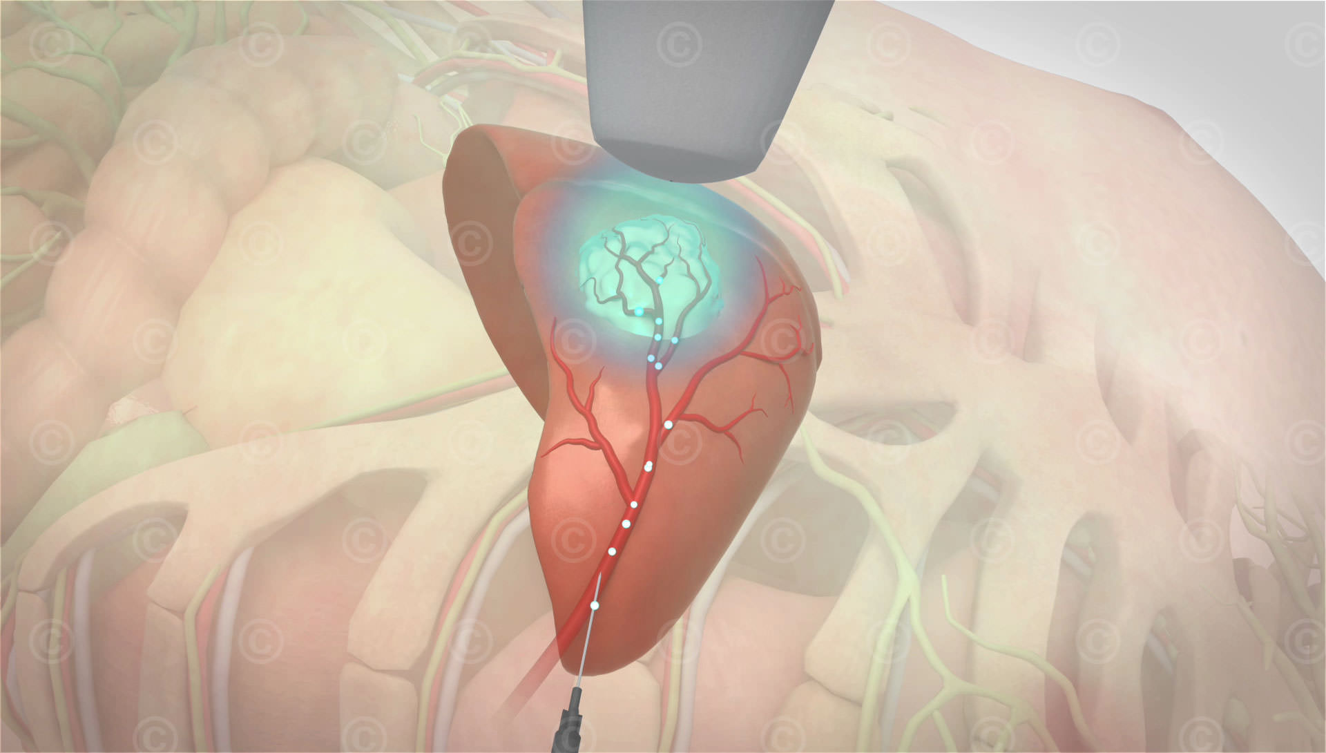 Bei einem Patienten mit einem oberflächlichen Leberkarzinoms wird nun die Verabreichung einer konventionellen Chemotherapie gezeigt. Hierbei verteilen sich die Wirkstoffe ungezielt im Körper. Um eine ausreichend hohe Konzentration des Wirkstoffs im Tumor zu gewährleisten, muss eine hohe Dosis gewählt werden.